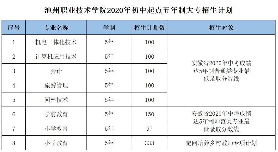 池州职业技术学院2020年初中起点五年制大专招生计划
