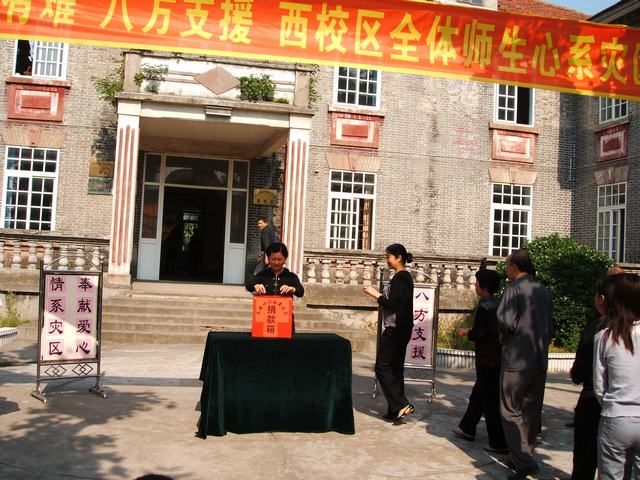 5月12日14时28分,四川省汶川县发生里氏7.8级强烈地震,灾区人民的生命财产遭受了重大损失。“灾害无情人有情,一方有难八方援”,院组宣处、学工部、工会、团委倡议向灾区人民伸援手,献爱心,齐心协力帮助灾区人民尽快恢复生产,重建家园,共享和谐。西校区积极响应,利用校园广播报道受灾和救灾情况,在校园张贴捐款救灾倡议书,并于5月16日上午8:40举行捐款活动。