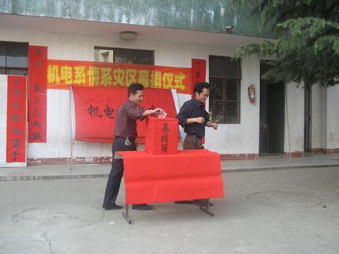 2008年5月12日下午,在四川省汶川县发生7.8级地震,至今已造成上万人罹难,数十万人流离失所,灾区人民的生命财产遭受了重大损失。为帮助受灾同胞度过难关,奉献我们的爱心,2008年5月十六日下午4点,机电系举行了“情系灾区募捐仪式”。